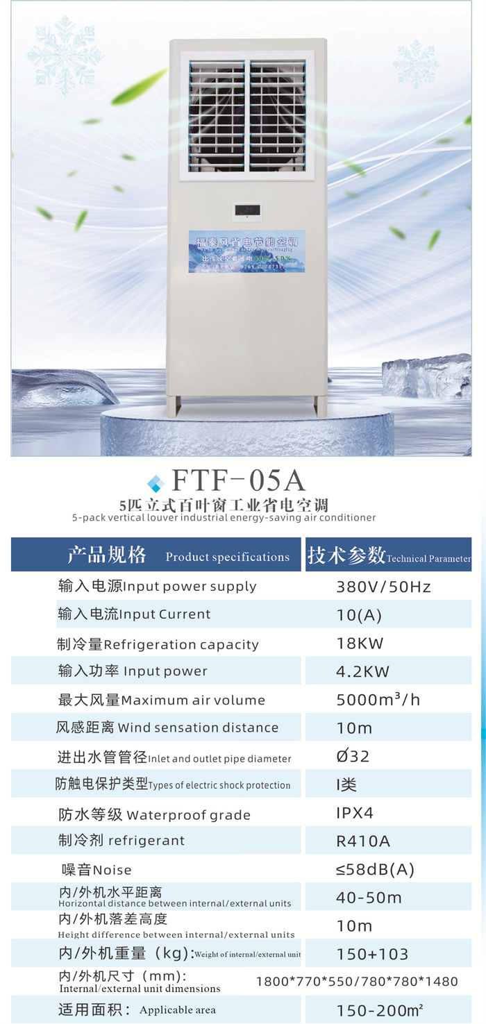 .節能省電、同等面積安裝比傳統空調省電30~50%,覆蓋面積大一臺5P的可以覆蓋200個平方車間降溫,出風口溫度可以做到13-16度。車間溫度可做到20-26度適合人體體感溫度。